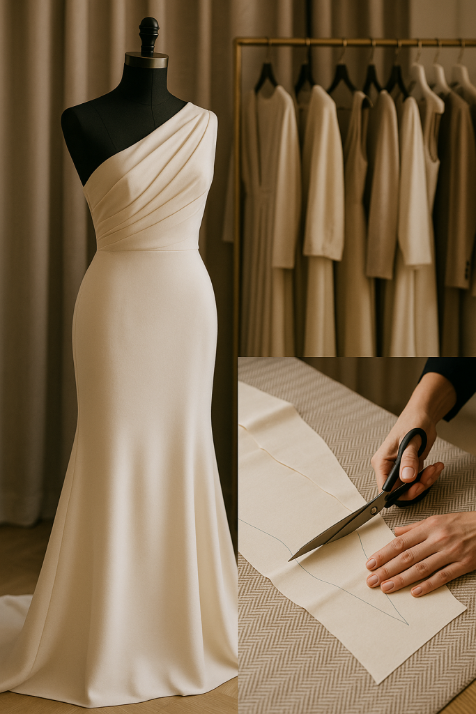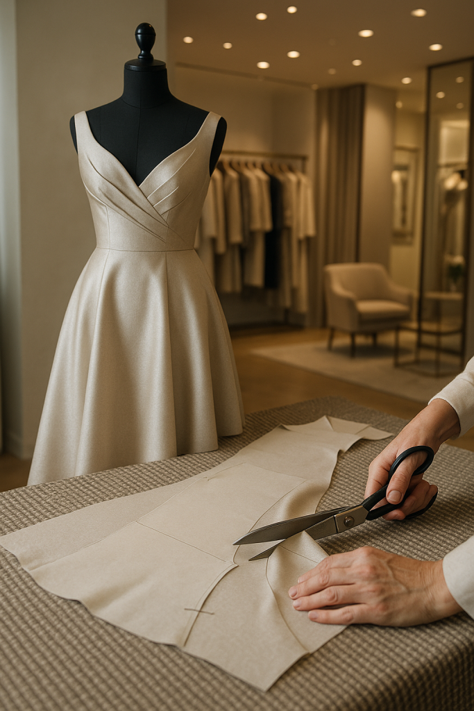 In our London-based manufacturing facility we mark the fabric with chalk or other safe markers, then expertly cut with shears or automatic cutters depending on the run size. Because luxury outerwear uses heavier fabrics, we often allow extra space for seam allowances and press-free allowance. It’s here that structure begins to be built: quality begins with accurate cutting. A tailor cutting wool fabric on a table with shears is a classic hero image for this step.